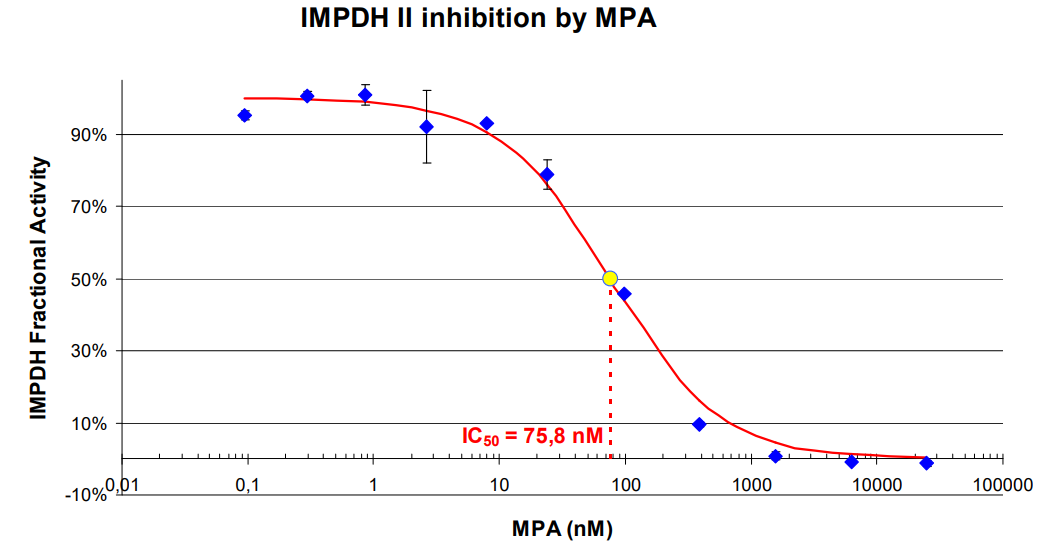 NOVOCIB's purified IMPDH 2 is an active enzyme characterized for its affinity for inosine 5'-monophosphate and NAD substrates, and its sensitivity to enzyme inhibitors such as mycophenolic acid and ribavirine-monophosphate.