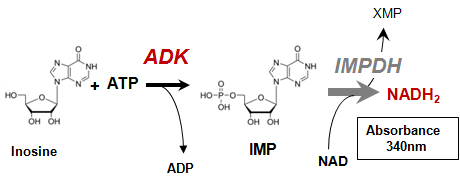 High Throughput Assay for Human Adenosine KinasePRECICE® ADK Assay Kit provides a convenient, high throughput compatible and non-radioactive assay for in vitro measurement of ADK activity and for Drug Discovery of novel ADK inhibitors. Novel tool for Drug Discovery, this kit allows HTS search of novel ADK inhibitors. Principle :Adenosine kinase uses ATP as the phosphate donor. It transfers the terminal phosphate group of ATP to a substrate, producing ADP as a by-product. The assay is based on the use of inosine as a surrogate ADK substrate and a coupled reaction involving a highly active IMPDH (Inosine Monophosphate Dehydrogenase) for a direct measurement of the inosine monophosphate (IMP) formed by ADK. In the presence of inosine and ATP, ADK catalyses the phosphorylation of inosine to form IMP and ADP. IMP is then immediately oxidized to XMP by a highly active IMPDH in the presence of NAD, leading to NADH2 formation. Key Features: Convenient