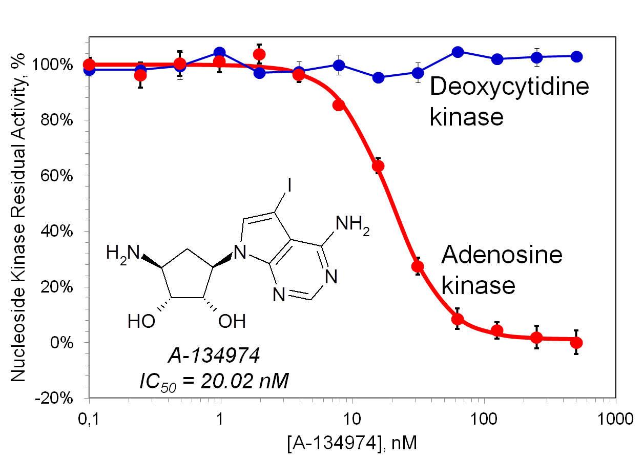 Adenosine kinase is a ubiquitous enzyme regulating intra- and extracellular concentrations of adenosine (AR), an important modulator of central nervous system functions and a signal molecule involved in hypoxia, inflammation and nociception. Together with adenosine demainase, adenosine kinase regulates intra- and extracellular cellular adenosine concentration. Inhibition of adenosine kinase results in selective increase of local adenosine concentrations and reduced seizure susceptibility and nociception in vivo(3). ADK dysfunction is involved in several pathologies, including diabetes(13), epilepsy(6), and cancer. Consequently, ADK emerges as a rational therapeutic target, and adenosine-regulating drugs have been extensively tested (1) as new analgesic and anti-inflammatory agents(4) to treat schizophrenia(7) or to limit brain injury after an ischemic stroke(8).