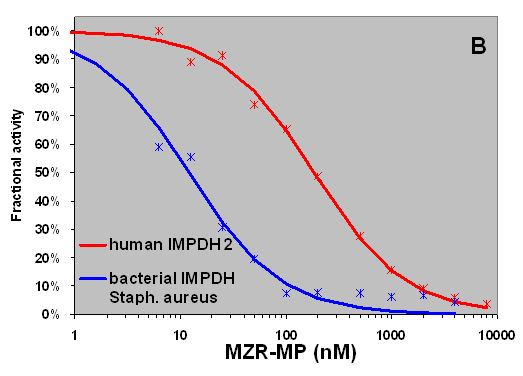 IMPDH inhibition: Effect of MPA (A) and mizoribine monophosphate (B) on human recombinant IMPDH II (red curve) and bacterial recombinant IMPDH of Staphylococcus aureus (blue curve). Enzymatic assays are performed in duplicate at 37�C in 0.1M KH2PO4 buffer pH 8.0 in the presence of 1mM DTT, 200�M NAD, 200�M IMP, 60nM Human IMPDH, Type 2 or 95nM IMPDH S.aureus. Reaction is followed in an iEMS Reader MF (Labsystems) microtiter plate reader at 340nm.