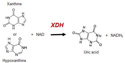 Xanthine oxidoreductase (XOR) catalyzes the formation of uric acid from hypoxanthine and xanthine, last two steps of purine catabolism. The mammalian enzyme is synthesized as a xanthine dehydrogenase form (XDH, EC 1.17.1.4), which uses NAD as the electron acceptor, but is converted into an xanthine oxidase form (XO, EC 1.1.3.22) by reversible (through sulfhydryl group oxidation) or irreversible (proteolysis) manner. Since most industrial protocols of XOR purification includes proteolysis step, commercial XOR enzyme is available only as oxidase form unable to use NAD as a an electron acceptor.